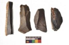 | Description / विवरण | There are n 4 utilized flakes. There are multi directional irregular scar pattern on both dorsal and ventral face of the flakes. Three are tapering at one end and one has sharp edge. |