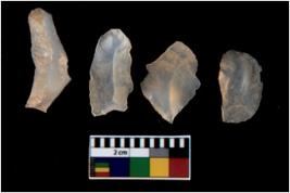 | Description / विवरण | There are n 4 utilized flake cores. There are multi directional irregular scar pattern on them. All of them are tapering at one end. |