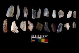 | Description / विवरण | Specimen of flakes tool with prominent flaking marks. It made up of a short flakes with sides trimmed. |