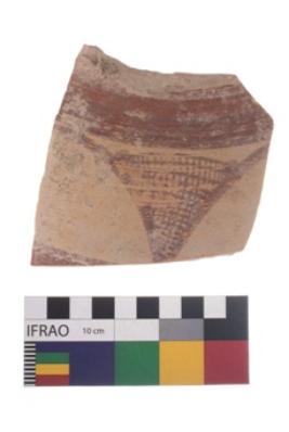 | Description / विवरण | Specimen of black on red ware with decorative geometric Loops forming triangles which are latticed painting. |
