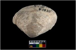 | Description / विवरण | Specimen of a large bivalve marine shell with ground edge. Probably used as spoon. |