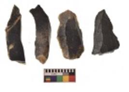 | Description / विवरण | There are n 4 utilized flakes. There are multi directional irregular scar pattern on both dorsal and ventral face of the flakes. Two are tapering at one end and two have sharp edges. |