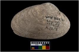 | Description / विवरण | Specimen of a large bivalve marine shell with ground edge. Probably used as spoon. |