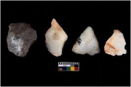 | Description / विवरण | There are n 4 cores; there are multi directional irregular scar pattern on them. Some of them are tapering at one end. 3 quartz and 1 chert |