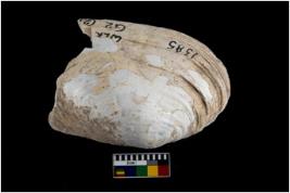| Description / विवरण | Fragment of a bivalve marine shell with irregular shape. |