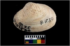 | Description / विवरण | Specimen of a large bivalve marine shell with ground edge. Probably used as spoon. |