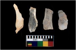 | Description / विवरण | There are n 4 utilized flake cores. There are multi directional irregular scar pattern on them. All of them are tapering at one end. |