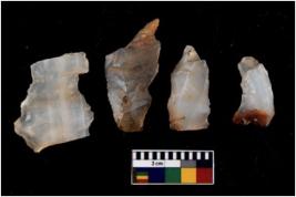 | Description / विवरण | There are n 4 flakes tool; there are flakes with sides trimmed, Marks of secondary flaking are present on the both the faces.The dorsal is relatively flat. |