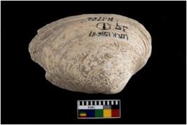 | Description / विवरण | Specimen of a large bivalve marine shell with ground edge. Probably used as spoon. |