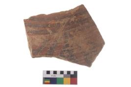 | Description / विवरण | Specimen of black on red ware with decorative geometric Three parallel lines and dark triangles painting. |