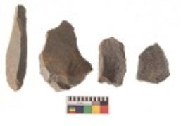 | Description / विवरण | There are n 4 utilized flakes. There are multi directional irregular scar pattern on both dorsal and ventral face of the flakes. One is tapering at one end and three have blunted edges. |