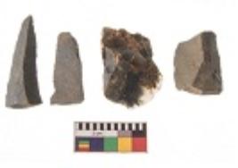 | Description / विवरण | There are n 4 utilized flakes. There are multi directional irregular scar pattern on both dorsal and ventral face of the flakes. Two are tapering at one end and two have blunted edges. |