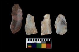| Description / विवरण | There are n 4 utilized flake cores. Out of them three are made up of Chalcedony and one is made up of Chert. There are multi directional irregular scar pattern on them. All of them are tapering at one end. |