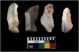 | Description / विवरण | There are n 4 utilized flake cores. There are multi directional irregular scar pattern on them. All of them are tapering at one end. |
