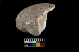 | Description / विवरण | Fragment of a bivalve marine shell with irregular shape. |