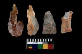 | Description / विवरण | There are n 4 utilized flake cores. There are multi directional irregular scar pattern on them. One is tapering at one end and three have sharp edges. |
