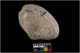 | Description / विवरण | Specimen of a large bivalve marine shell with ground edge. Probably used as spoon. |