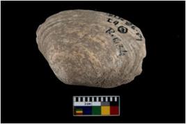 | Description / विवरण | Specimen of a large bivalve marine shell with ground edge. Probably used as spoon. |