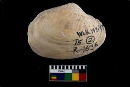 | Description / विवरण | Specimen of a large bivalve marine shell with ground edge. |