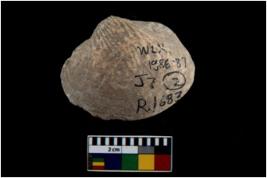 | Description / विवरण | Specimen of a large bivalve marine shell with ground edge. Probably used as spoon. |