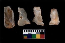 | Description / विवरण | There are n 4 utilized flake cores. There are multi directional irregular scar pattern on them. All of them are tapering at one end. |
