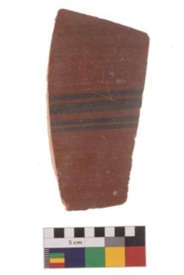 | Description / विवरण | Specimen of black on red ware with decorative geometric Four parallel lines painting. |