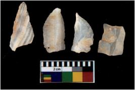 | Description / विवरण | There are n 4 utilized flake cores. There are multi directional irregular scar pattern on them. One is tapering at one end and three have sharp edges. |