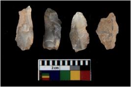 | Description / विवरण | There are n 4 utilized flake cores. There are multi directional irregular scar pattern on them. All of them are tapering at one end. |