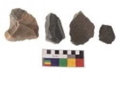 | Description / विवरण | There are n 4 utilized flakes. There are multi directional irregular scar pattern on both dorsal and ventral face of the flakes. One has sharp edge and three have blunted edges. |