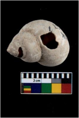 | Description / विवरण | Specimen of a small conch shell with a transverse perforation on the side. |
