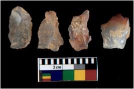 | Description / विवरण | There are n 4 utilized flake cores. There are multi directional irregular scar pattern on them. All of them are tapering at one end. |