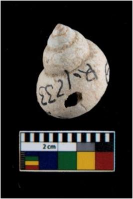 | Description / विवरण | Specimen of a small conch shell with a transverse perforation on the side. |