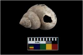 | Description / विवरण | Specimen of a small conch shell with a transverse perforation on the side. |