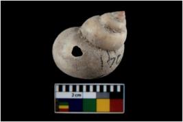| Description / विवरण | Specimen of a small conch shell with a transverse perforation on the side. |