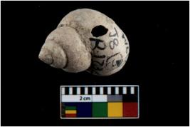 | Description / विवरण | Specimen of a small conch shell with a transverse perforation on the side. |