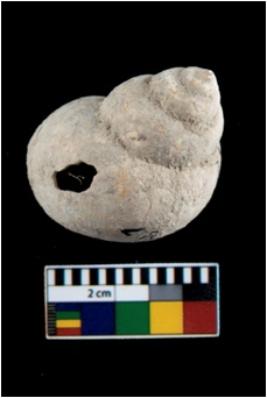 | Description / विवरण | A small conch shell with a transverse perforation on the side. |