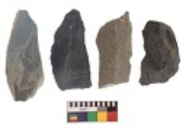 | Description / विवरण | There are n 4 utilized flakes. There are multi directional irregular scar pattern on both dorsal and ventral face of the flakes. One is tapering at one end and three have sharp edges. |