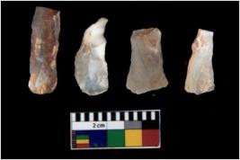 | Description / विवरण | There are n 4 utilized flake cores. There are multi directional irregular scar pattern on them. All of them are tapering at one end. |