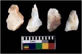 | Description / विवरण | There are n 4 utilized flake cores. There are multi directional irregular scar pattern on them. One is tapering at one end and three have sharp edges. |