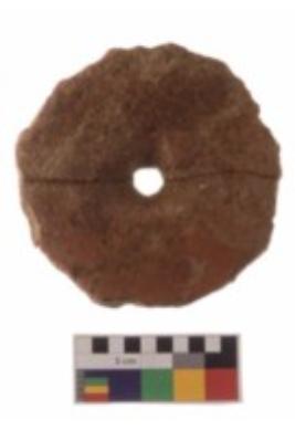 | Condition Description / स्थिति का विवरण | Perforated disc of Red ware; it has a rough surface and is uneven at the periphery. |