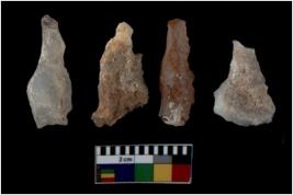 | Description / विवरण | There are n 4 utilized flake cores. There are multi directional irregular scar pattern on them. All of them are tapering at one end. |
