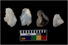 | Description / विवरण | There are n 4 utilized flake cores. Out of them three are made up of Chalcedony and one is made up of Chert. There are multi directional irregular scar pattern on them. Two are tapering at one end and two have blunted edges. |