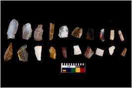 | Description / विवरण | Specimen of flakes tool with prominent flaking marks. It made up of a short flakes with sides trimmed. |