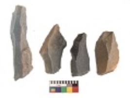 | Description / विवरण | There are n 4 utilized flakes. There are multi directional irregular scar pattern on both dorsal and ventral face of the flakes. Three are tapering at one end and one has sharp edge. |