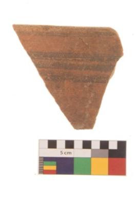 | Description / विवरण | Specimen of black on red ware with decorative geometric Three parallel lines painting. |