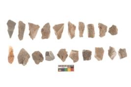 | Description / विवरण | There are n 20 utilized flakes. There are multi directional irregular scar pattern on both dorsal and ventral face of the flakes. Among them most of them have sharp edges, and few have broken tip. |