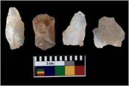 | Description / विवरण | There are n 4 utilized flake cores. There are multi directional irregular scar pattern on them. Two are tapering at one end and two have blunted edges. |