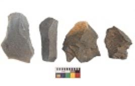 | Description / विवरण | There are n 4 utilized flakes. There are multi directional irregular scar pattern on both dorsal and ventral face of the flakes. Two are tapering at one end and two have blunted edges. |
