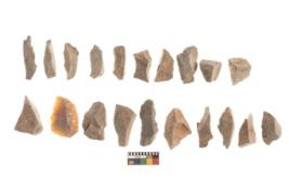 | Description / विवरण | There are n 20 utilized flakes. There are multi directional irregular scar pattern on both dorsal and ventral face of the flakes. All are sharp edges, and few have broken tip. |