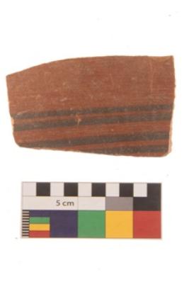 | Description / विवरण | Specimen of black on red ware with decorative geometric Four parallel lines painting. |